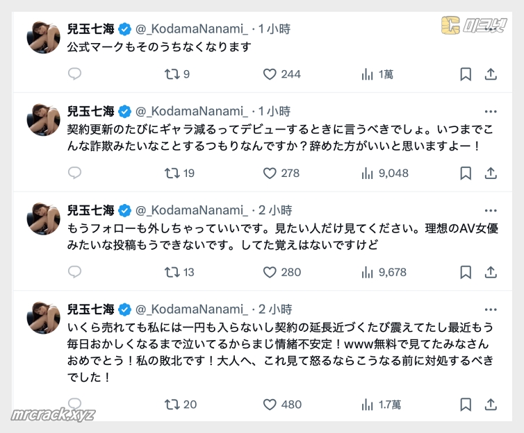 지난 2024년 4월 AV 배우로 복귀했던 코다마 나나미(兒玉七海)가 최근 자신의 X(구 트위터) 계정을 돌연 삭제해 팬들의 우려를 낳고 있습니다. 계정 삭제 전 그녀가 남긴 의미심장한 글들이 공개되면서, 다시 한번 금전적 문제로 인해 활동을 중단하는 것이 아니냐는 추측이 제기되고 있습니다.