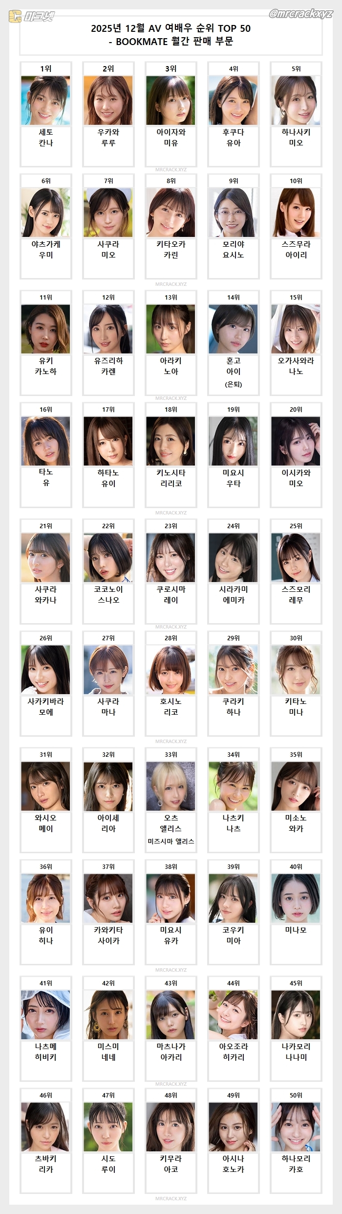 2025년 12월 AV 여배우 순위 TOP 50 - BOOKMATE 월간 판매 부문